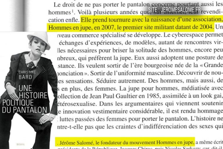 Cité par l’historienne Christine BARD dans son livre « Une histoire politique du pantalon » comme « le fondateur du mouvement Hommes en jupe ».