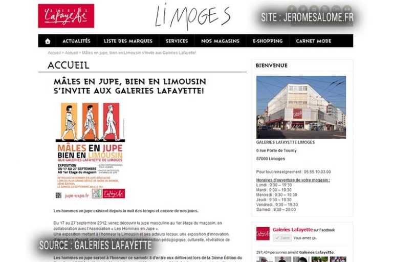En collaboration avec Marie PIQUEUX, Responsable Marketing et Communication chez Galeries Lafayette, j’ai organisé ladite exposition aux galeries de Limoges et un défilé de huit hommes en jupe pour le même magasin. Lien vers l’expo / Lien vers le défilé
