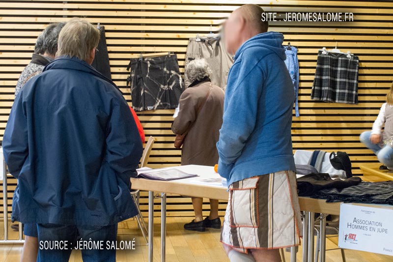 Jamais, à notre connaissance, il n’y a eu autant de jupes pour hommes de couturiers différents regroupées dans un même endroit en France : pas moins de 6 couturiers de 4 pays différents : Royaume-Uni, Belgique, Suisse et France. Des jupes courtes, des jupes longues, des droites, des amples, avec poches, sans poches, … une vraie diversité était présentée en quelques coup d’oeil. Pour l’anecdote, des femmes venues à l’exposition « jalousaient » les hommes car elles ne trouvaient dans leurs boutiques les styles de jupes présents ici.