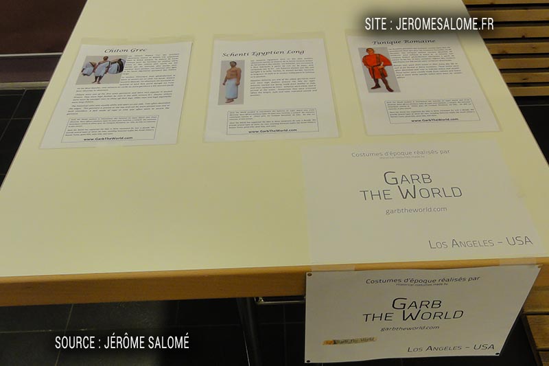 Une couturière de Los Angeles, spécialisée dans la confection de costumes d’époque, nous a permis de montrer « en vrai » des tenues portées par des hommes grecs, romains et égyptiens et accompagnées de textes explicatifs. A cela ce sont ajoutées deux tenues portées par les hommes d’Asie. Pour l’anecdote : un garçon de 9 ans, passionné d’histoire nous expliqua sa grand-mère, faisait des aller-retour entre les croquis/textes et les tenues, desquelles il a fait le tour pour voir comment elles étaient faites et portées. Il a noté dans le livre d’or « J’ai bien aimé les robes ».