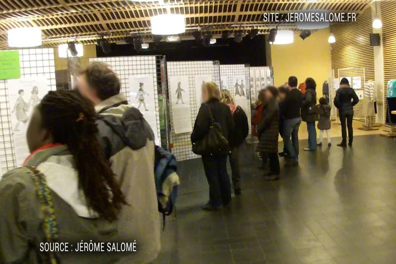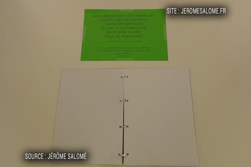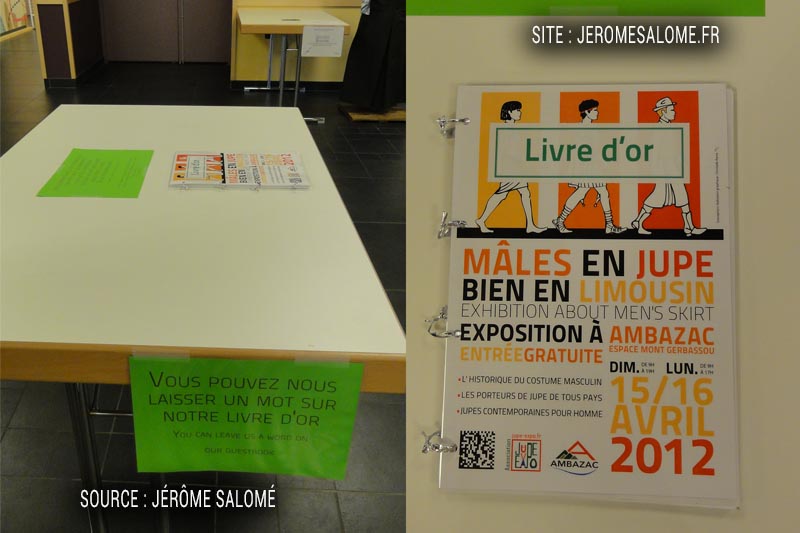 Des visiteurs ont laissé un petit mot, un commentaire, un avis sur le livre d’or à disposition et je l’ai remercie. Beaucoup des avis laissés concernaient l’exposition elle-même et donc l’important travail que celle-ci m’a donné. Ces messages tous positifs sur l’exposition et encourageant m’ont personnellement touchés. Se sont ajoutés des commentaires oraux, tous aussi positifs. Suite à la visite d’un professeur, un lycée nous a même proposé d’accueillir l’exposition lors de ses portes ouvertes de mars 2013. Pour l’anecdote : certaines femmes venues à l’exposition jalousaient les hommes présents car les jupes allaient mieux à ces hommes qu’à elles.