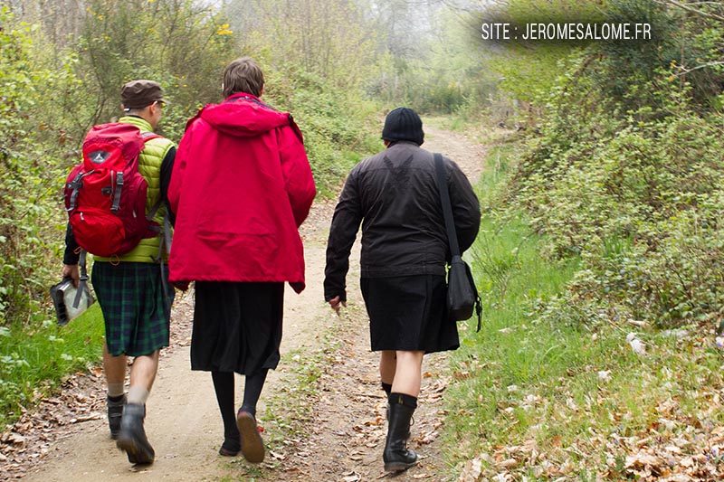 En parallèle de l’exposition, le dimanche matin était organisée une randonnée d’hommes et de femmes où les hommes étaient en jupe. Pascal est un homme du CAF (Club Alpin Français) de Limoges qui a découvert l’existence du projet d’exposition via un randonneur porteur de jupe du CAF de Paris (Christian). Pascal est devenu l’un des hommes du Limousin qui ont joué les mannequins d’un jour pour une séance photo, en jupe, réalisée par Christelle Rama. Et c’est là qu’il a eu l’idée d’organiser cette randonnée le jour de l’exposition à laquelle ont participé des personnes du coin et d’autres régions.