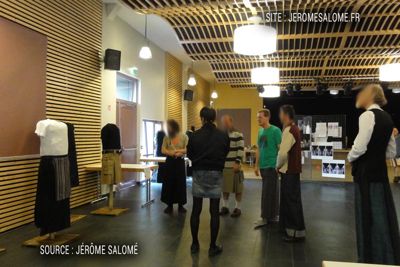 Durant deux années scolaires, nous avons pu travailler sur le sujet de la jupe pour homme avec des classes du domaine de la mode de deux lycées de Limoges. A l’occasion de l’exposition, nous avons présenté le travail réalisé par des étudiantes de BTS. C’est ainsi que les visiteurs ont pu découvrir huit jupes pour hommes portées par des mannequins sur pied et les planches de croquis correspondants, montrant de quelles bases se sont inspirées les étudiantes. Un des objectifs donnés aux étudiantes était de créer des jupes qui pourraient plaire aussi aux hommes qui n’en portent pas à ce jour. Parmi ces huit jupes, plusieurs ont plu à la fois à des hommes qui ont l’habitude de porter ce vêtement et à la fois à des hommes qui l’ont découvert via l’exposition. Propos d’un homme en jupe de Paris : « J’ai trouvé les modèles réalisés par les étudiantes de Limoges très élaborés et dignes des modèles proposés par les créateurs confirmés ». Les tissus et accessoires ont été chaleureusement donnés par un magasin de tissus de Limoges.