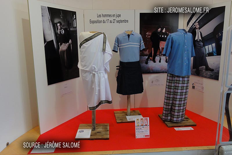 L’exposition étant trop importante, je n’ai pu tout installer donc étant dans un magasin de mode j’ai pioché parmi les jupes pour homme de couturiers et d’étudiantes et les photos d’hommes en jupe. Souhaitant montrer néanmoins une tenue d’époque, j’ai sélectionné un Chiton grec.