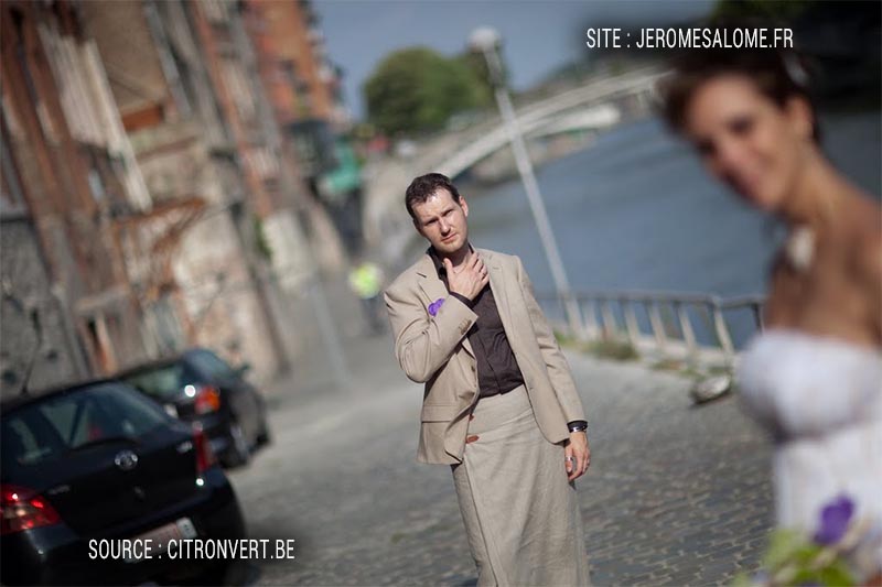Mais ce besoin d’originalité nous a également poussés à nous interroger sur chaque petit détail. Nos tenues n’ont donc pas dérogé à la règle. Alors que ma fiancée avait opté pour une magnifique robe importée d’Asie, j’ai choisi de me marier en jupe. Il s’agit d’une longue jupe en lin naturel. Une coupe très classique et élégante que je dois à Anders Landinger. Le plus difficile fut de trouver le reste de la tenue car il n’existe pas vraiment de code, pas vraiment de repères en la matière. J’ai cherché des exemples sur internet mais en vain. Il m’a donc fallu inventer la tenue complète autour de cette jupe. Finalement, j’ai trouvé une chemise et un veston (que j’ai dû faire retoucher) relativement classiques afin de trancher avec la fantaisie du port de la jupe. J’ai également eu la chance de tomber sur une très bonne boutique de chaussures ou j’ai pu trouver un modèle original et en parfaite harmonie avec le reste. Finalement, une bonne demi-journée aura suffi pour composer l’ensemble.